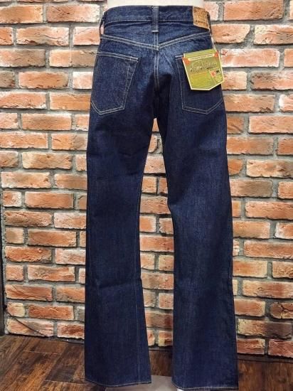 鉄製の唐草柄ドーナツボタン。コインポケットは戦時の物資統制によってリベットが省略されている。熱を与えると縮みが激しいラベルは取り扱いに注意が必要。オリジナルのセルビッジデニムを使用。